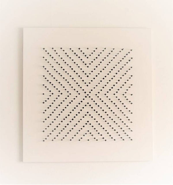 White square piece of art with upside down spikes in