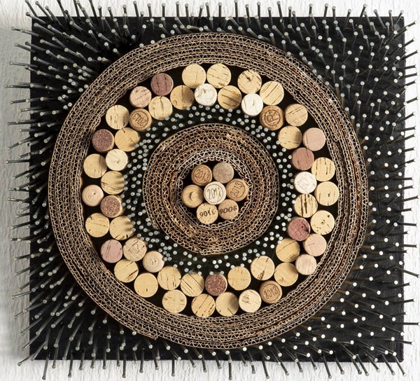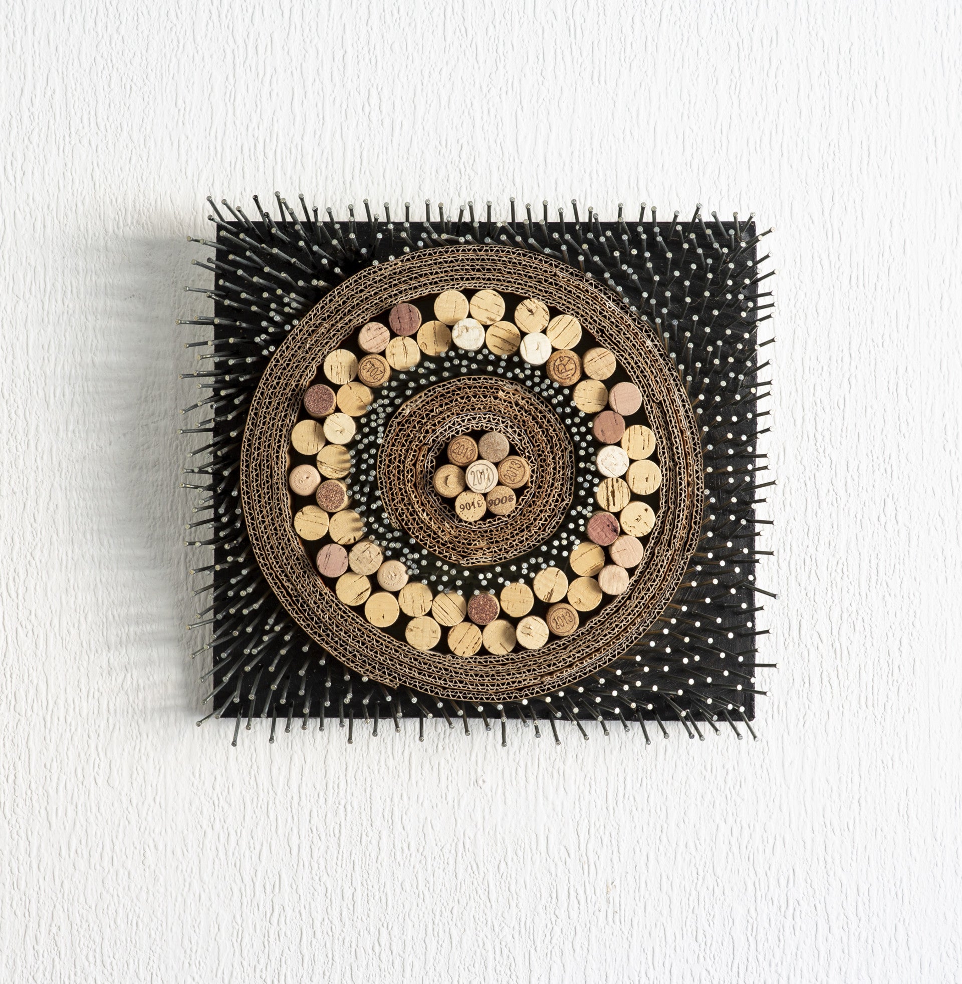 Square painting full of spikes and corks.