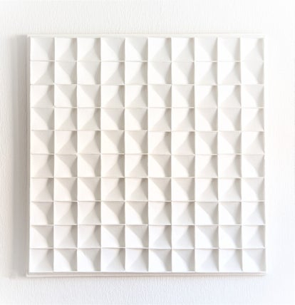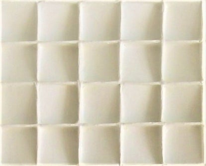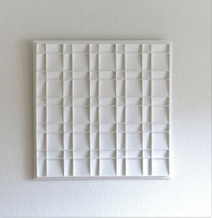 White abstract painting with eighty-four white squares in a repetitive geometrical pattern.
