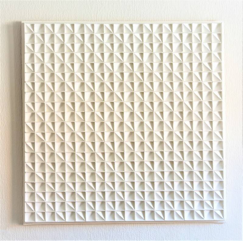 He sells modern minimalist white paper art in 3d in repetitive patterns. In the style of the Zero Group of the sixties.